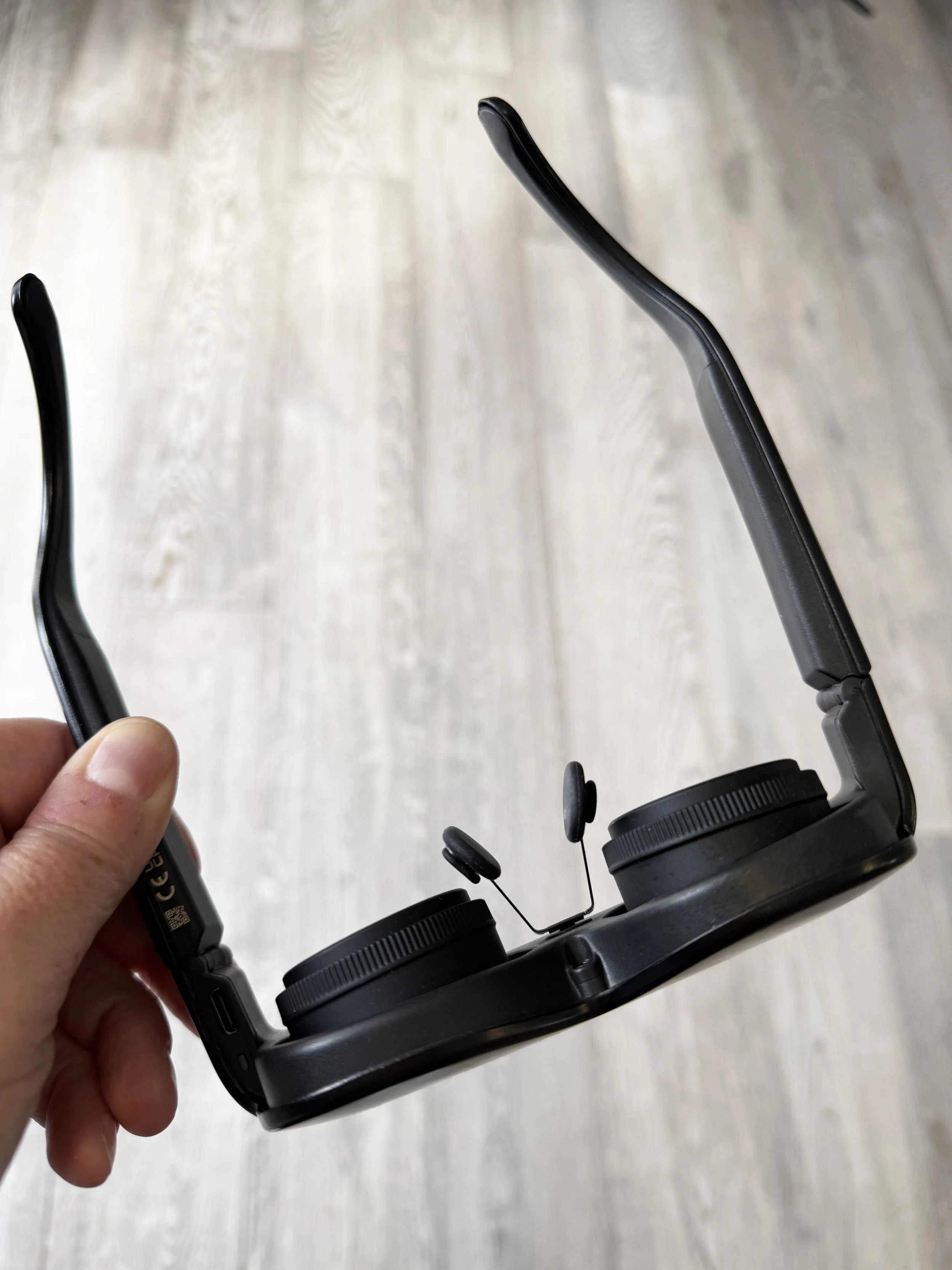 Sideview of the glass showing how thick they are, the adjustable lenses, and nose pads.
